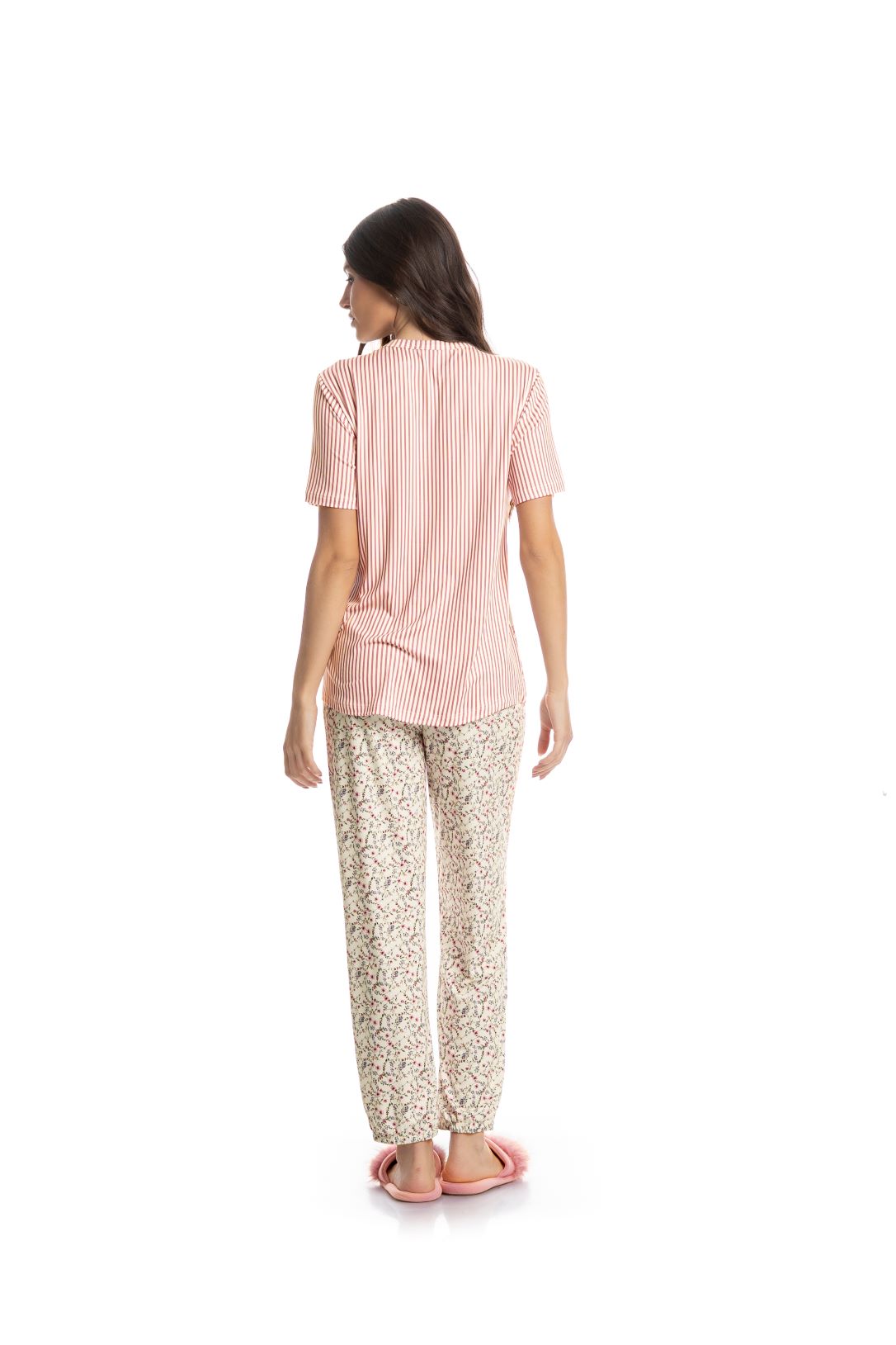 tecido skin Pijama calça comprida com blusa de manga curta da Coleção Flower, ideal para unir conforto e praticidade. Confeccionado em tecido Skin Touch, com combinação de poliéster e elastano, oferece toque macio, leveza e excelente elasticidade. Um conjunto confortável e delicado, perfeito para proporcionar bem-estar em todos os momentos de descanso.