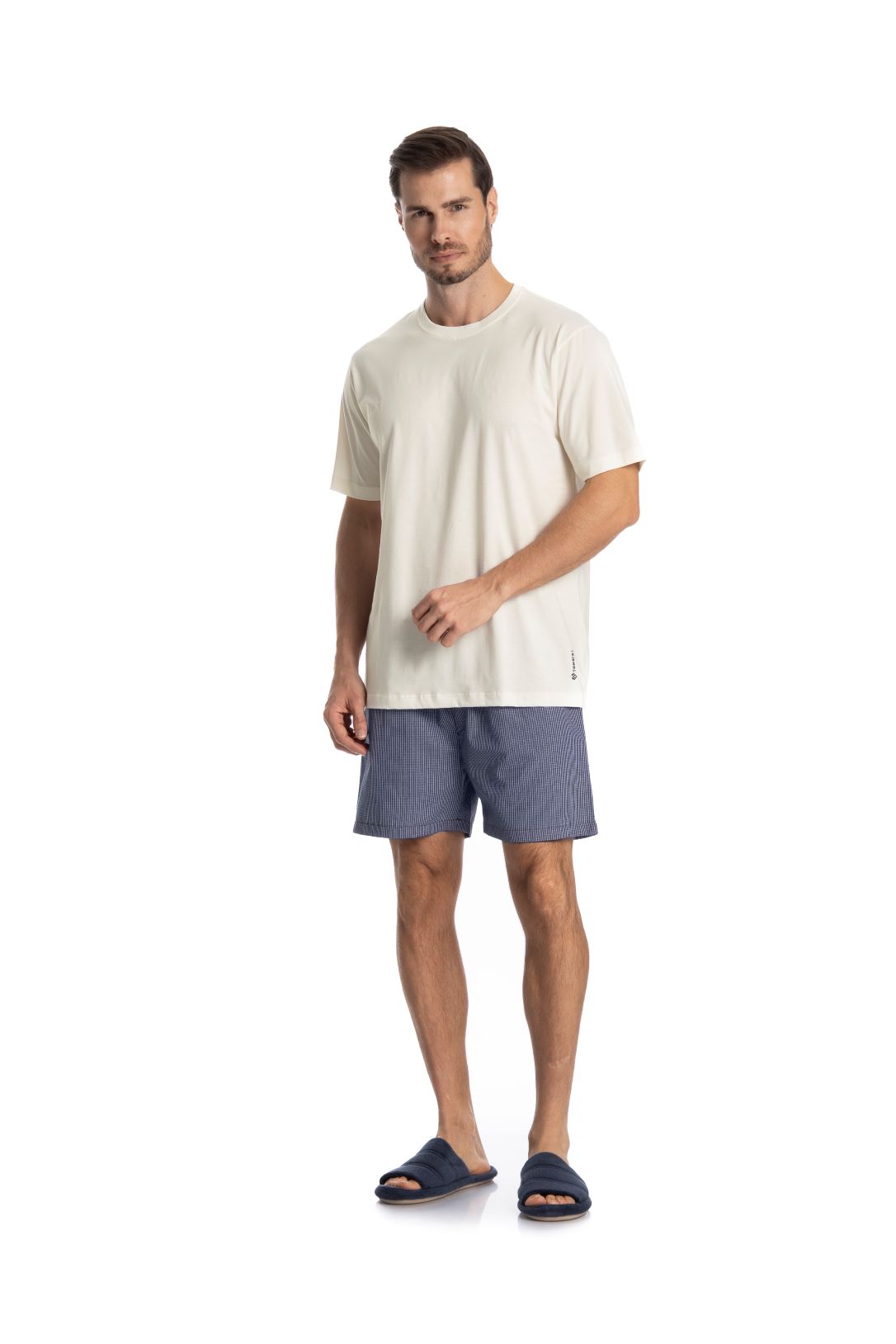 Pijama curto em algodão, ideal para noites leves e confortáveis. O short em tecido de algodão garante toque macio, respirabilidade e liberdade de movimentos. Com design versátil e aconchegante, é a escolha perfeita para relaxar com conforto e bem-estar.