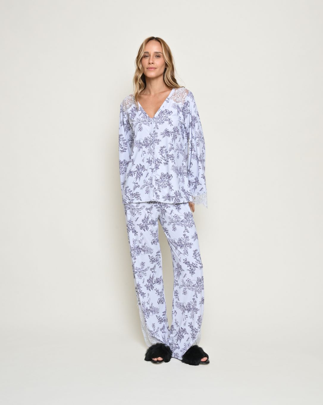 Pijama longo com camisa de manga longa com botões, trazendo elegância e conforto para suas noites. Possui delicados detalhes em renda nas mangas e na calça, que acrescentam charme e feminilidade à peça. Confeccionado em tecido Fluity, macio, leve e muito confortável, com estampa delicada que valoriza o conjunto. Um modelo especial da Coleção Geovana, perfeito para momentos de descanso com estilo.